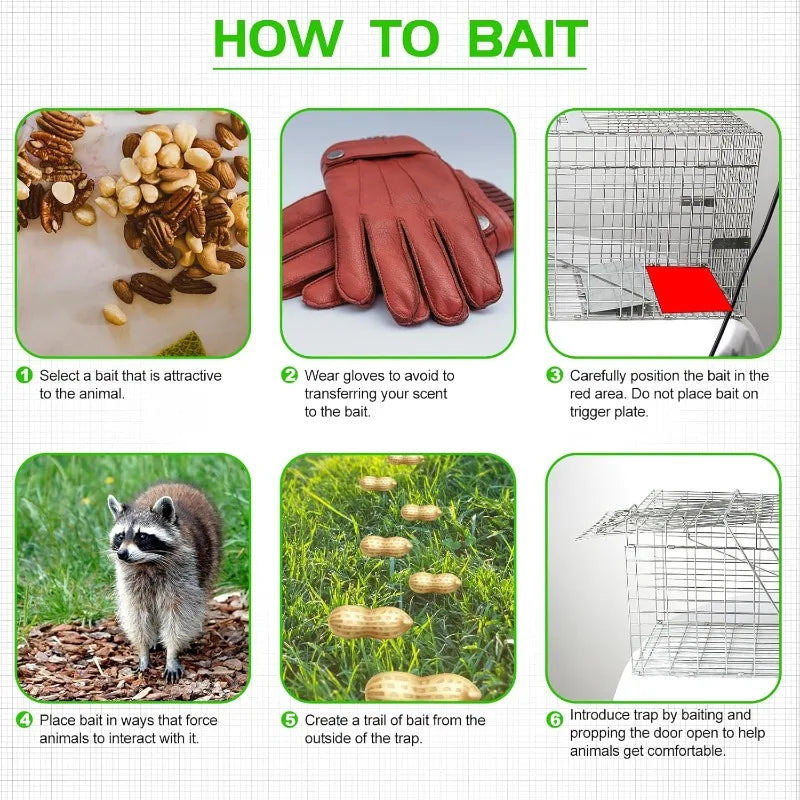 Humane Live Animal Trap: Our raccoon trap use oblong support frame to secure the cage shape and use fixing clips to fix rear door,smoothed internal edges protect and prevent trapped animal being injured.All you need is some bait to catch and then release them back to the wild.