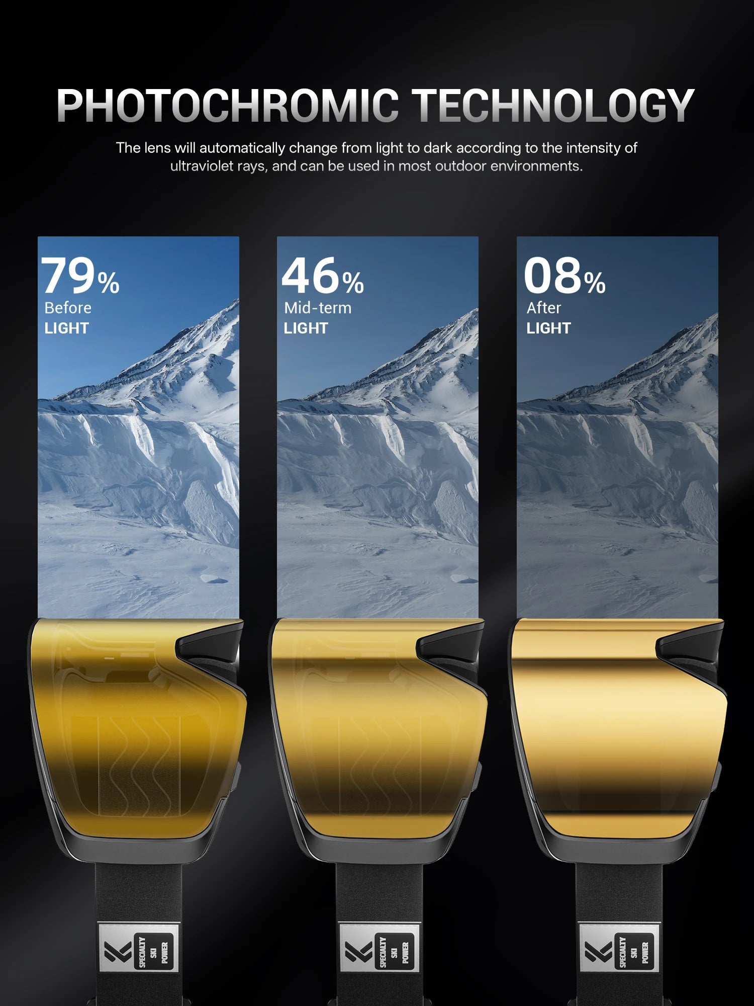 Meet the KAPVOE Outdoor Photochromic Ski Goggles UV400 Anti Fog Magnetic Snow Glasses — engineered for peak performance in changing alpine conditions. The photochromic lenses automatically adjust tint based on UV intensity, delivering clear vision from bright sun to twilight snow. With UV400 protection and an oleophobic coating, these goggles shield eyes and shed moisture for spotless visibility on the slopes.
